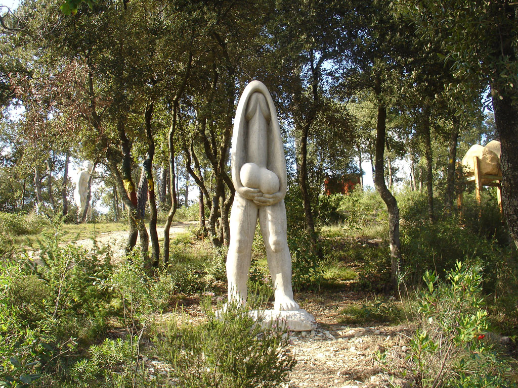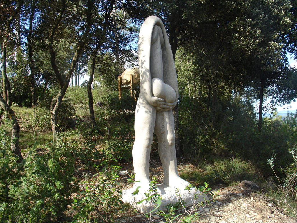Recreació de la figura grecoromana de priop. De cintura en amunt està ocupada per un fal·lus que sembla que li faci de cap mentre les mans sostenen els testicles.